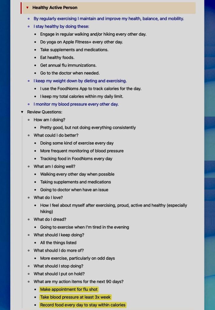 I filled in my answer to each question directly under the question, indented. I highlighted any action items in yellow. As I was working on a section, I would add new tasks to the inbox of my task manager, Things. I added and removed habits from the Streaks app.